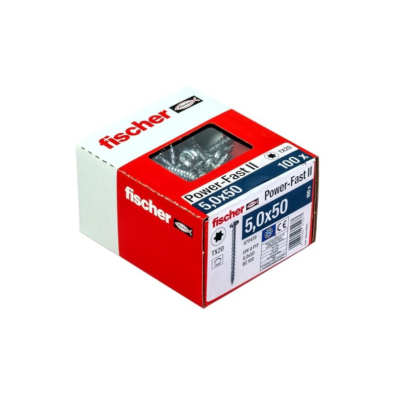 • Box contents: 100 x PowerFast II (item no. 670439), chipboard screws (5.0 x 50) with pan head, inner star socket and full thread of fischer