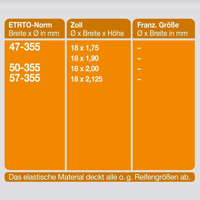 | Size: | ETRTO: 47/57-355 | 18 Zoll | breit |