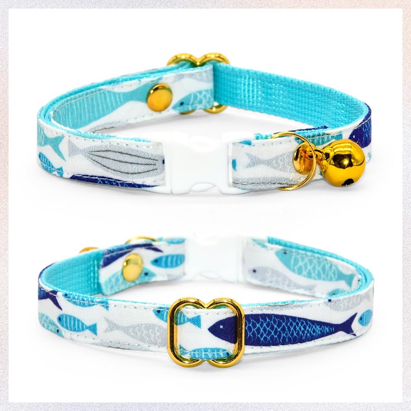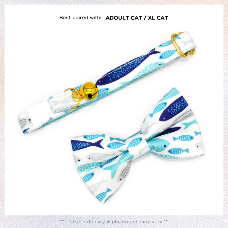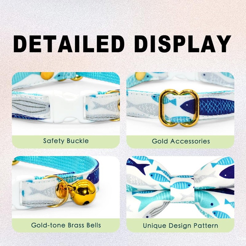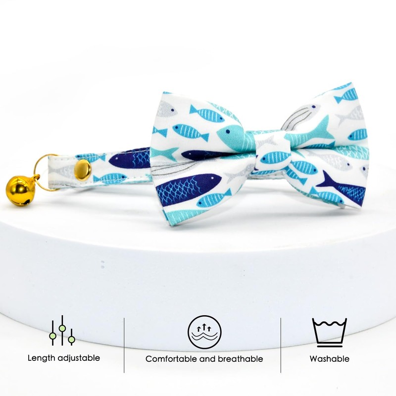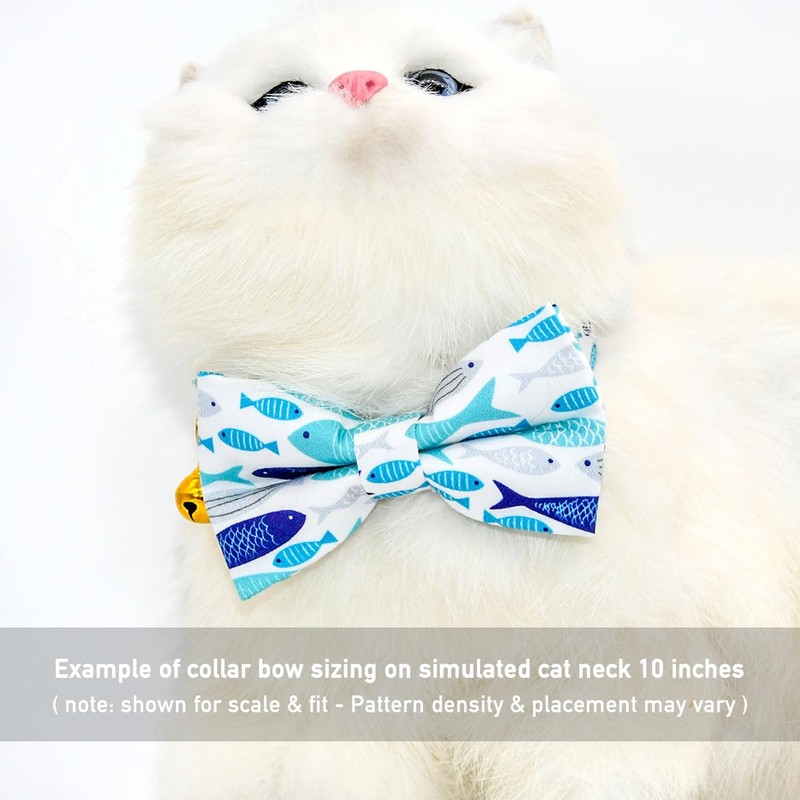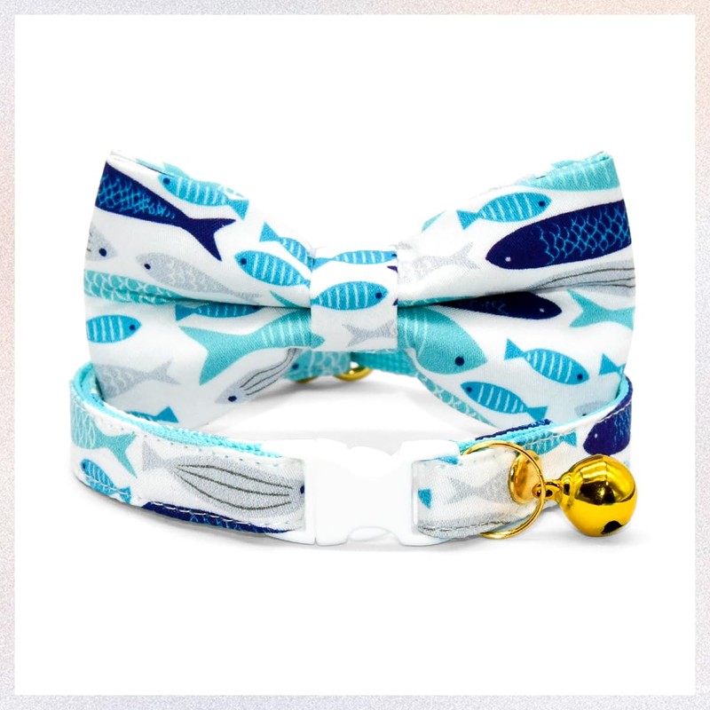 Fish Cat Bow Tie Collar, Blue Cat Collar, Breakaway with Bell, Safety Plastic Buckle Collar for Cats