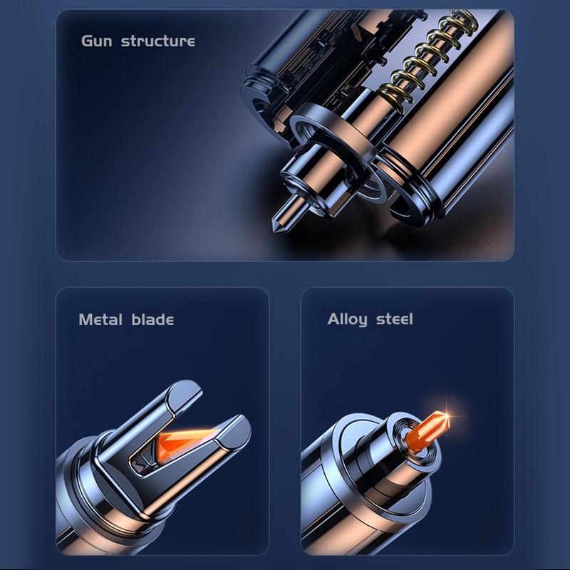 Der Zwei-in-Eins-Auto-Notfallhammer vereint Glasbruch- und Sicherheitsgurt-Schnittfunktionen in einem. Er ist mit einem harten und scharfen Hammerkopf ausgestattet, der im Notfall schnell die Autoscheibe einschlagen kann, um Ihnen bei der sicheren Flucht zu helfen. Speziell für den Einsatz unter Wasser entwickelt, ist die Unterwasserperkussion unabhängig vom Einfluss des Wasserdrucks immer noch kraftvoll. Kompakt und tragbar, kann es häufig an Schlüsselbunden, Autotüren usw. verwendet werden, um Ihre Sicherheit jederzeit zu gewährleisten. Das Sicherheitsdesign vermeidet unbeabsichtigte Verletzungen und der Federmechanismus sorgt dafür, dass Hammerkopf und Fräser nur bei Bedarf freigelegt werden. Wird mit einem Doppelhammer geliefert, der sowohl ein praktisches Autozubehör als auch ein aufmerksames Geschenk ist und Ihren Verwandten und Freunden beim Fahren eine zusätzliche Sicherheitsebene bietet.