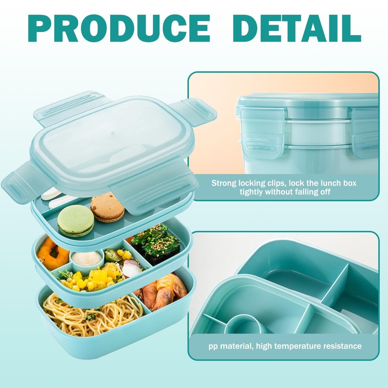 Diese Edelstahl-Lunchbox ist aus lebensmittelechtem PP-Material, BPA-frei, sicher und ungiftig, robust und langlebig, ideal für eine gesunde Ernährung.1900ml großes Fassungsvermögen mit herausnehmbaren Fächern, flexible Partition Design, einfach zu Vorspeisen, Obst, Salate und Saucen zu speichern, so dass das Essen organisiert ist und nicht kaskadieren. Silikon-Dichtungsstreifen und auslaufsichere Verschlussschnalle mit doppeltem Schutz, seitliches Sicherheitsknopf-Design, kann leicht geöffnet und geschlossen werden. Die Lunchbox kann in der Mikrowelle erwärmt, im Kühlschrank aufbewahrt und in der Spülmaschine gereinigt werden, eine Box kann den gesamten Prozess der Essenszubereitung, des Tragens und der Erwärmung übernehmen und spart so Zeit und Mühe. Drei Arten von Geschirr sind im Lieferumfang enthalten, um unterschiedliche Bedürfnisse zu erfüllen. Egal, ob Sie zur Arbeit fahren, ein Picknick im Freien veranstalten oder Ihre Kinder zur Schule gehen, die Box kann Einwegverpackungen ersetzen, ist umweltfreundlich und praktisch. Kompakte und tragbare Größe, mit benutzerfreundlichem Design, macht jede Mahlzeit frisch, bequem und sicher!