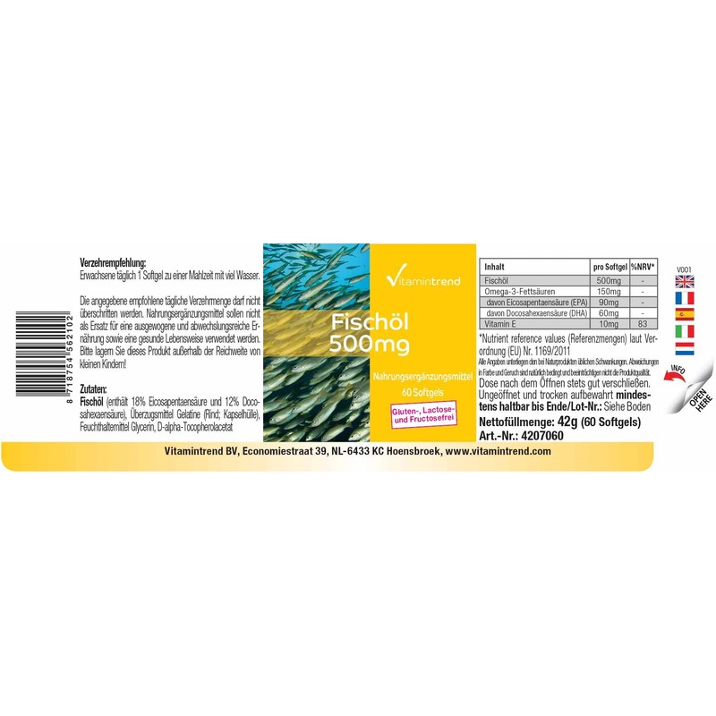 Fish Oil 500 mg - 60 Softgels, Natural Source of Omega-3 Fatty Acids, 18% EPA and 12% DHA, Safe Dosage Vitamintrend®