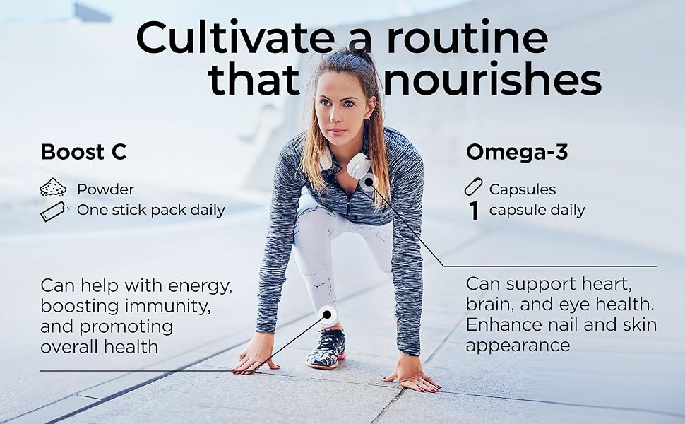 - Daily Ritual of Self-Care: Incorporate these nutritional essentials into your wellness routine with ease. Whether it's stirring Boost C into your morning smoothie or taking an Omega3 capsule with dinner, each act becomes a mindful moment of self-nurturing.