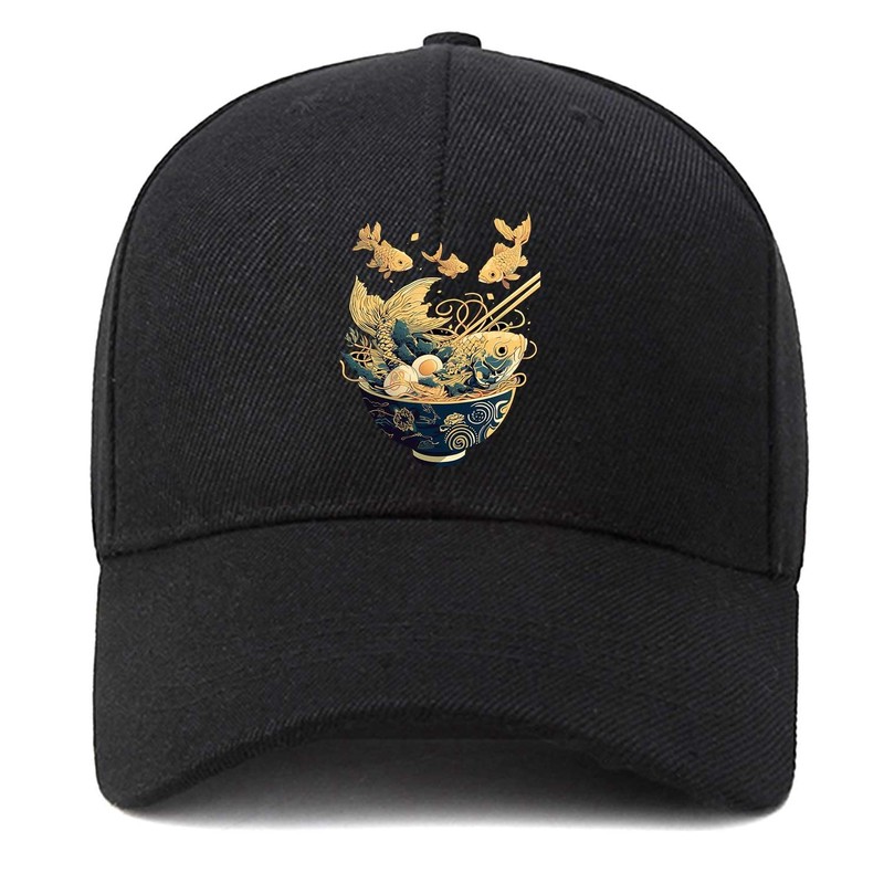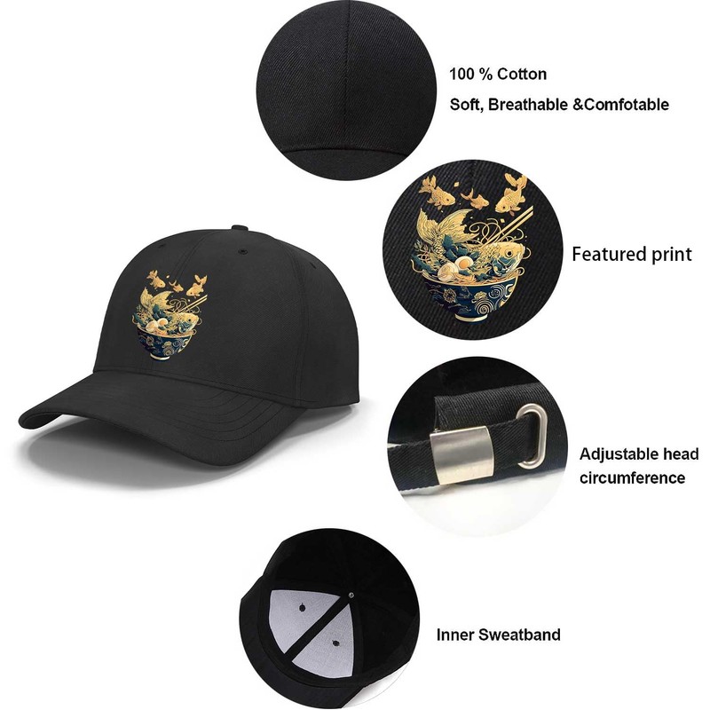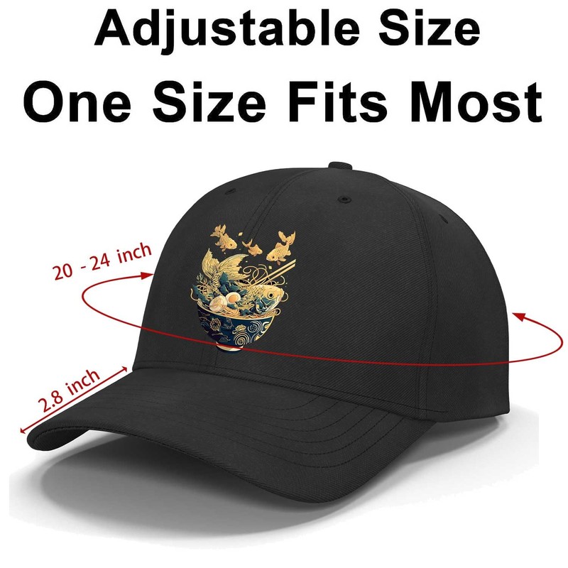 - đź’®The Fish Ramen baseball cap is made of 100% premium cotton, which is soft, comfortable and breathable for all day wear. Adjustable hat fit strap closure, one size fits most head sizes. Not easy to fall off; Adjustable hat fits with strap closure, one size fits most head sizes.