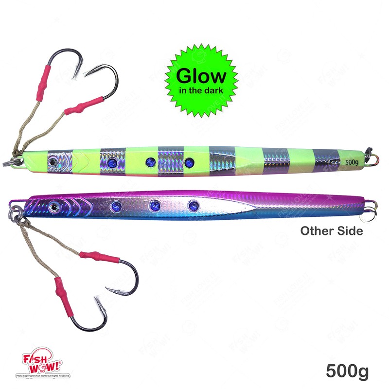 Fish WOW!® 500g Speed jig 17.5oz Fishing Vertical Knife Trolling Jig Fast Fall Metal Flat Bait with Two Assist Hook Blue Pink Silver Glow Stripes