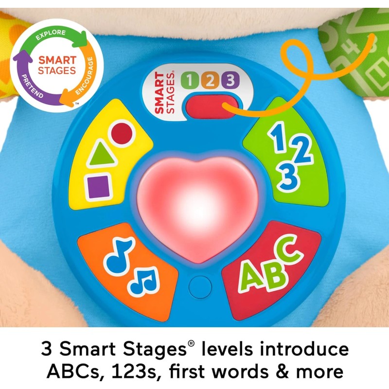 ​Laugh & Learn Smart Stages Puppy from Fisher-Price is a snuggly plush musical toy that introduces baby to the alphabet, shapes, first words and more! Little ones can press the 5 buttons on Puppy’s tummy to see his heart light up in different colors as 80+ songs, sounds and phrases play. Featuring more than 12 original songs and 3 Smart Stages learning levels that grow along with your child from infant to toddler, Smart Stages Puppy is sure to be baby’s best friend. Requires 3 AA batteries, included. Colors and decorations may vary.