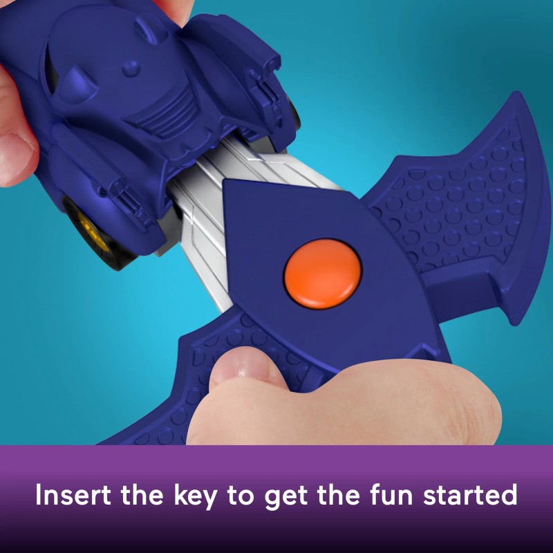 - Insert the activating key into the back of the vehicle and press the button to launch the Batwheels character into action