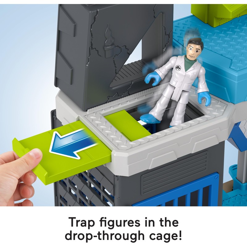 • Movable launcher with net projectile lets kids “capture” loose dinosaurs; cage with drop-through lid for fun trapping action