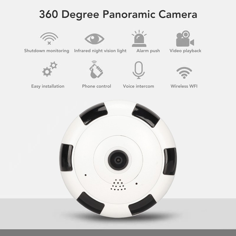 1、Panoramic Monitor: The fisheye lens provides 360° panorama viewing angle, no monitoring blind spots, high definition, high resolution image. 2、Clear Image: 3 million pixels, clearer image presentation, clearer details, exquisite colors, adopts high performance low light sensor, and clear display of every detail. 3、Video Recording: Supports memory card for loop recording, and support external TF card (can support 8G‑128G), which makes video storage more convenient. 4、Multifunctional: Support two way audio, clear voice, smooth communication, powerful infrared night vision function, ensure clear picture quality even in low light environment. 5、Motion Alarm: Wireless WIFI connection, support motion detection alarm, when a mobile object is detected, the camera will push the alarm message in real time.