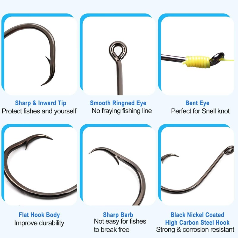 - Premium Quality Material:: Made from high carbon steel and finished with black nickel coating, these circle hooks provide exceptional strength, rust resistance, and long-lasting performance for both fresh and saltwater fishing.