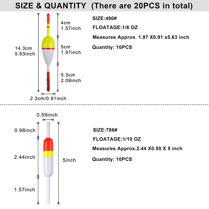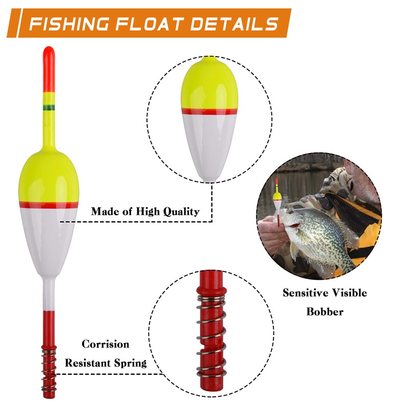 • High-visibility Colors: Bright fishing bobbers makes it easier to see when the fish take the bait.High visibility yellow and orange top fluorescent paint provides superior visibility from any distance.