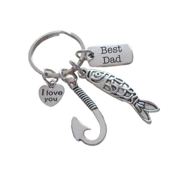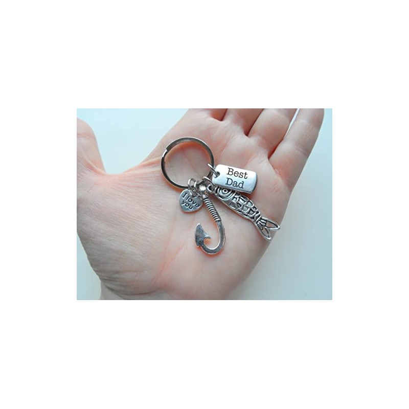 Fishing Charm Keychain with Hook & Fish Charm, I Love You Heart and Best Dad Tag, Father's Keychain