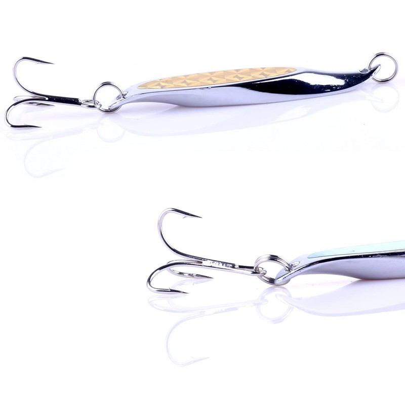 - It is made of all metal, will not break, corrode, strong and durable, with five different colors of shimmering coating, the reflective effect is very good, dragging in the water will have a very dazzling flash effect, easier to be found by fish, and To attack.
