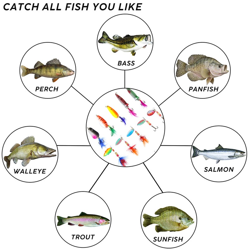This lure kit comes with various types of lures which fit different conditions, target most popular species. Such as: trout, panfish, smallmouth bass, pickerel, white bass, snapper blues, mackerel, walleye and pike. For different seasons, this kit assures inspiring catching. Enjoying fishing fun!