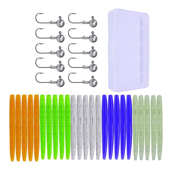Fishing Soft Lures, Soft Baits Kit, Worm Trailer Grub, Jig Head Hook, Soft Plastic Baits, for Trout Redfish, Saltwater Freshwater, 20/35/75/120PCS with Box (35PCS: 25 Soft Lure+ 10 jig Head)