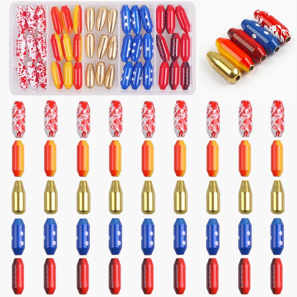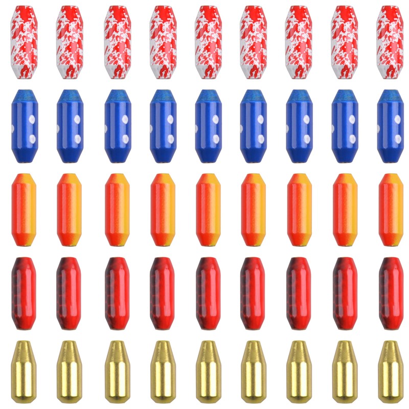 - PACKAGE: Total 45pcs spinner lure bodies in 5 different colors, each color 9pcs. Dimension: pill type lure body:0.05oz/0.22*0.63", bullet type lure body: 0.04oz/0.2*0.5",0.08" hole for most fishing lines