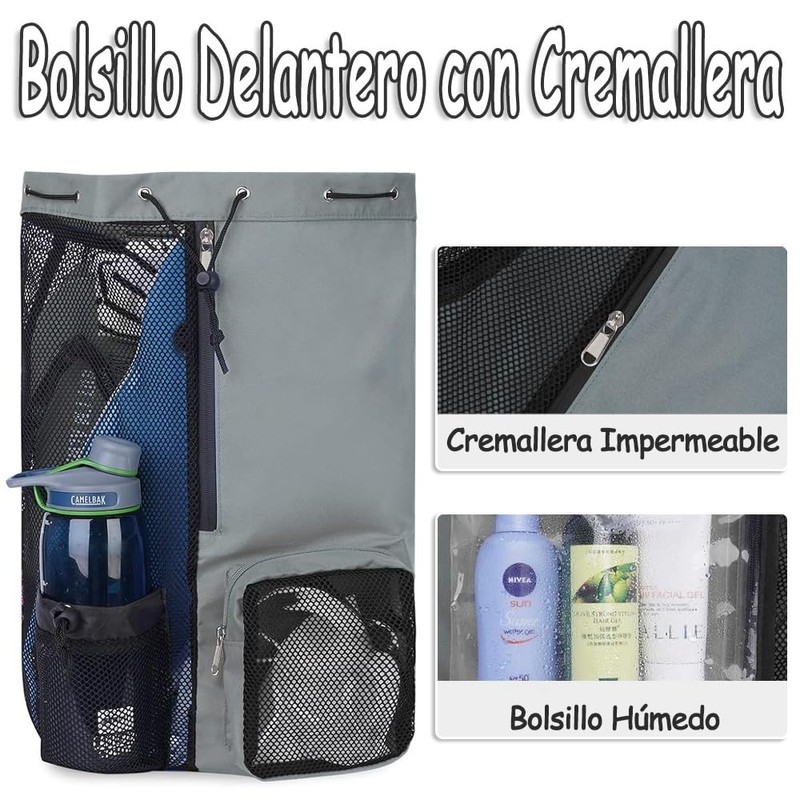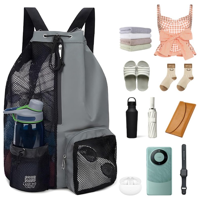 Fishlead Mochila Deportiva con Cordón, Bolsas de Malla para Natación, Mochila de Gimnasio Impermeable para Hombre Mujer, con Área Húmeda y Seca, para Senderismo, Viajes, Playas, Deportes (Gris)