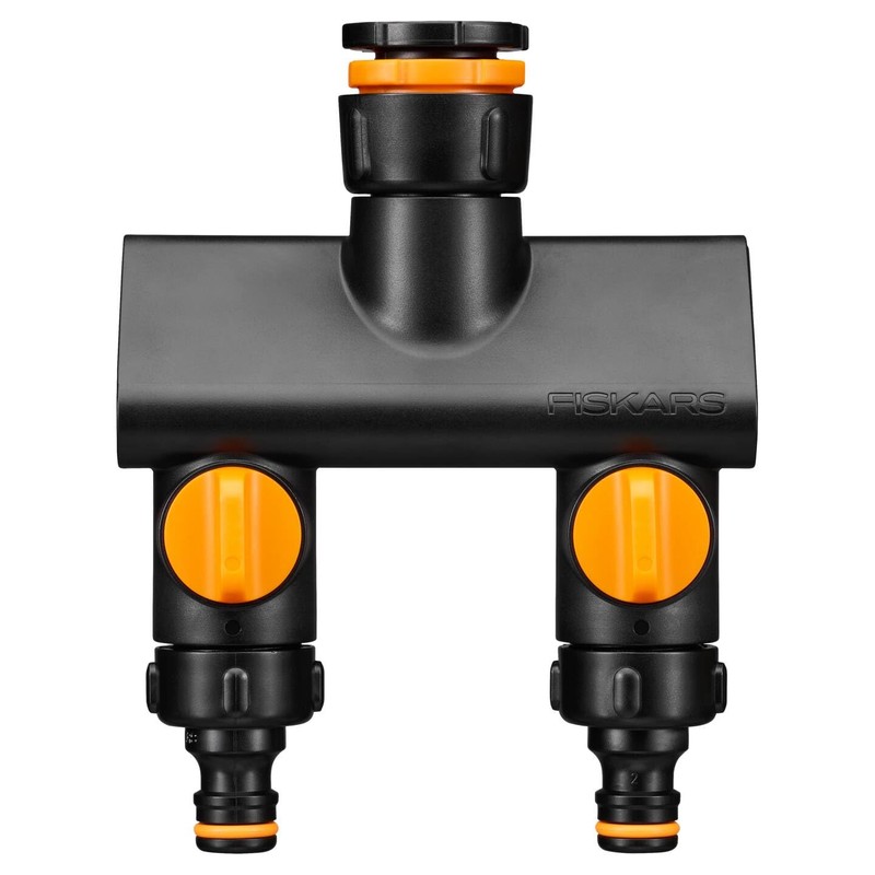 Fiskars 2-way valve, with on/off switches, for 3 thread sizes diameter 21 mm (1/2 inch), diameter 26.5 mm (3/4 inch) and diameter 33.3 mm (1 inch), comfort, black/orange, 1070577
