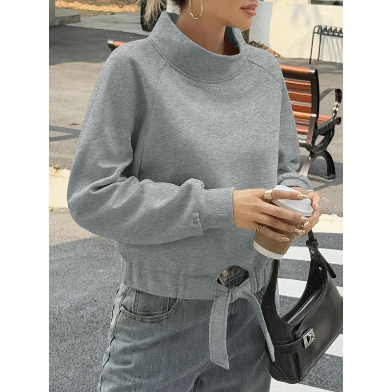Fisoew Women's Cropped Sweatshirts Casual Turtleneck Fleece Long Sleeve Tie Front Loose Fall Pullover Tops Grey