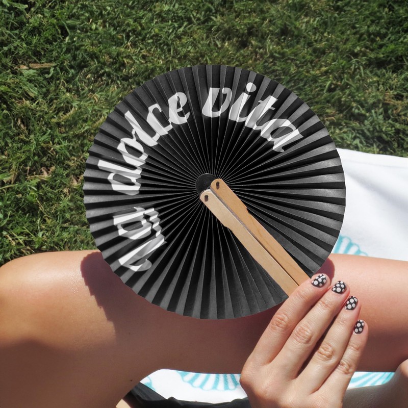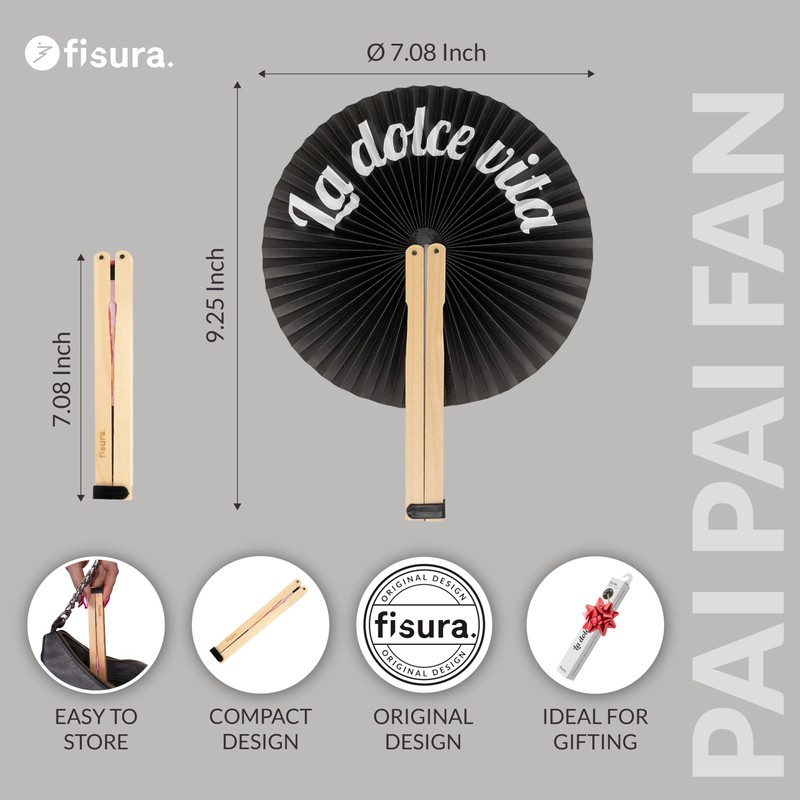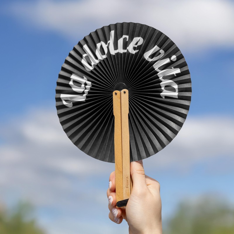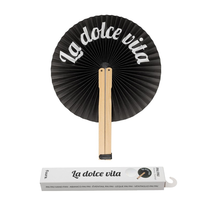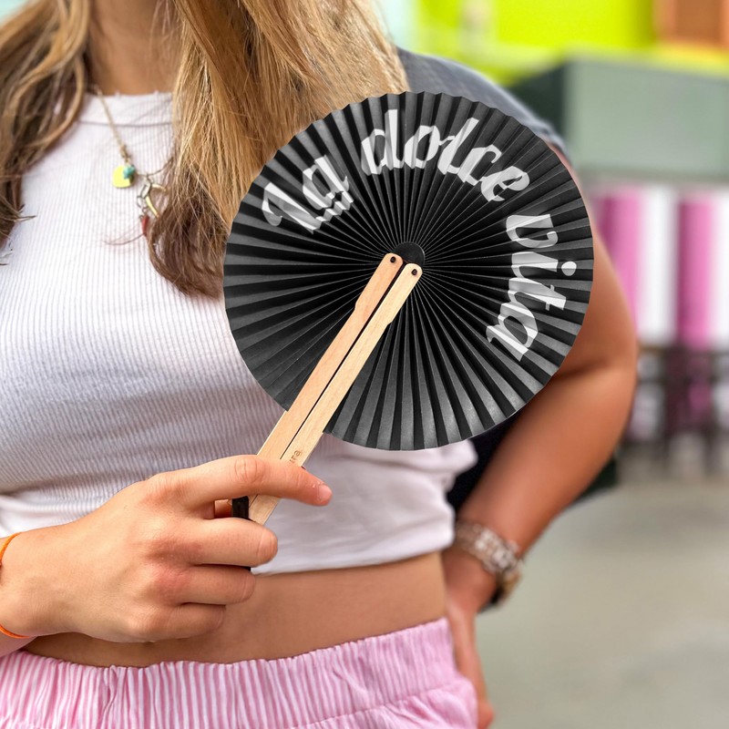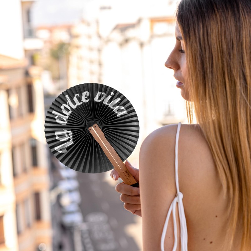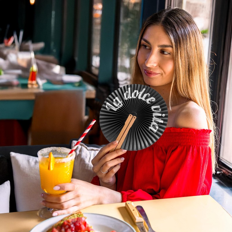 - MESSAGE FAN - Enjoy the summer in the purest Italian style with this black fan with the message "la dolce vita". Perfect for those who know that life is enjoyed on low heat, between terraces, laughter and good vibes. Make every wave of air transport you to the Italian coast!