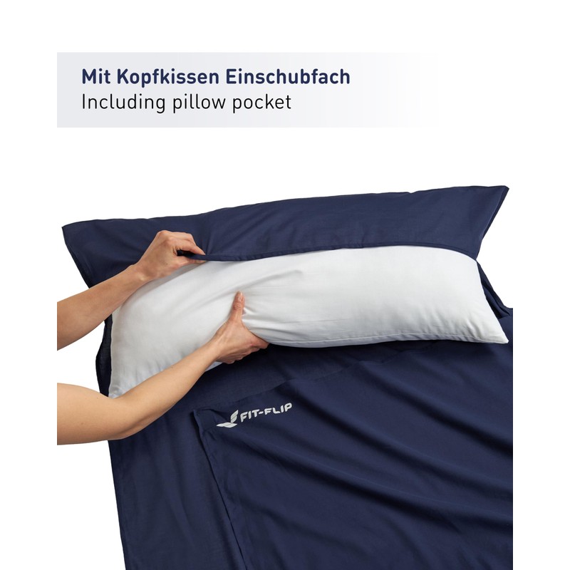 Fit-Flip Cabin Sleeping Bag Cotton – Ultralight Sleeping Bag Inner 325 g – Thin Travel Sleeping Bag – Compact, Small & Silky Soft – Sleeping Bag Lining with Pillow Compartment – Colour: Navy Blue