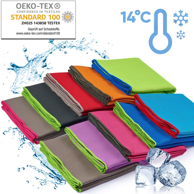 - Cooling without chemicals: Cooling towels with natural cooling effect, without chemicals. The specially woven mesh structure of the cooling towel creates a strong cooling effect through evaporation cooling. You only have to wet the towel, wring and shake it 1–2 times vigorously to activate its cooling effect.