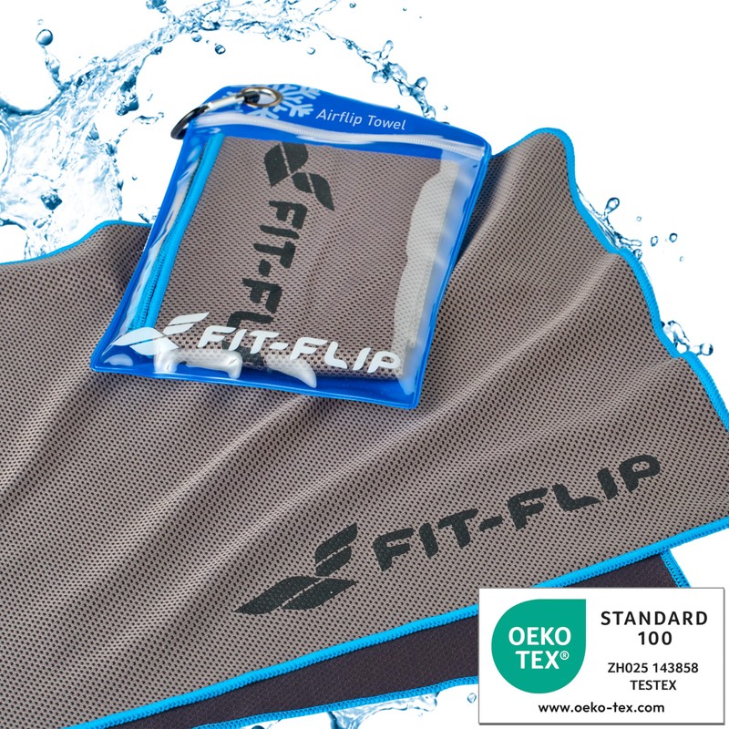 - High-quality material composition: Our cooling towel is made from 55% polyamide and 45% polyester and is Oeko-Tex Standard 100 tested. The high polyamide content makes our airflip towel extremely soft and creates a better cooling effect. In addition, there is no unpleasant odour, as is often the case with 100% polyester cooling towels.