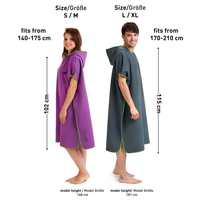 - Unisex fit: Our microfibre bath poncho for women and men is available in 2 sizes: Size M (body height 140–175 cm) and L (body height 170–210 cm). The extra-large and long cut changing towel provides 100% privacy for all body types.