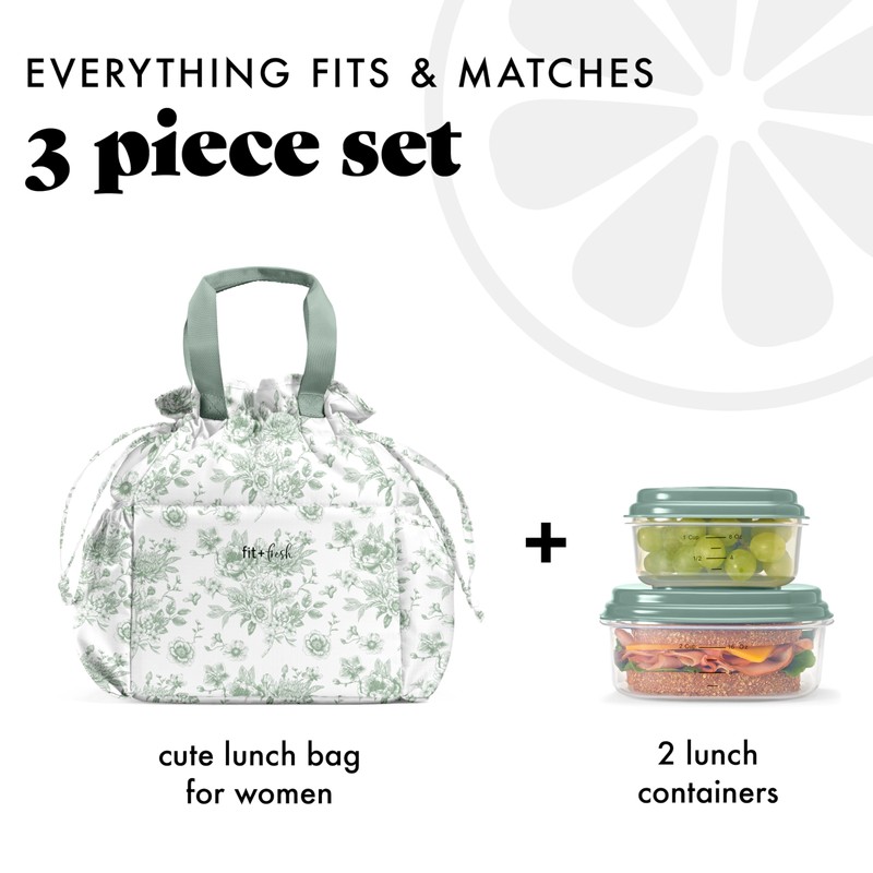 Fit & Fresh Cromwell Drawstring Lunch Bag for Women, Complete Lunch Set with 2 Containers, Stain-Resistant, Leak-Resistant, Back to School Essential, Teacher Lunchbox, Sage Floral Toile