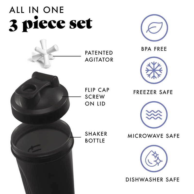 - FEATURES - Patented agitator designed to break up clumps for a smooth drink. BPA free, freezer safe, and dishwasher safe! This durable shaker bottle has a screw-on lid that creates a leak proof seal with a flip cap that snaps closed.