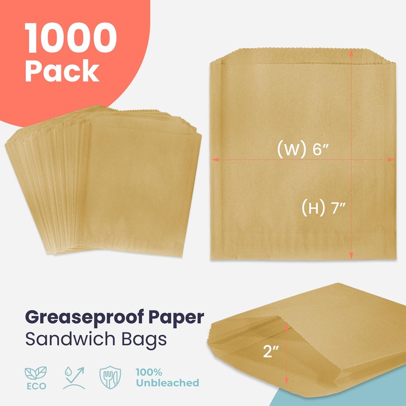 - 100% Food Grade & Value Pack: 1000 packs of high-quality, no-wax, and grease-resistant sandwich paper bags. Each bag measures 7 x 6 x 1" and is designed to meet your needs. Ideal safe paper sandwich bags for kids. Whether you run a bakery, food truck, or coffee shop, these cookie bags for packaging are a must-have for serving and packaging your delectable creations.