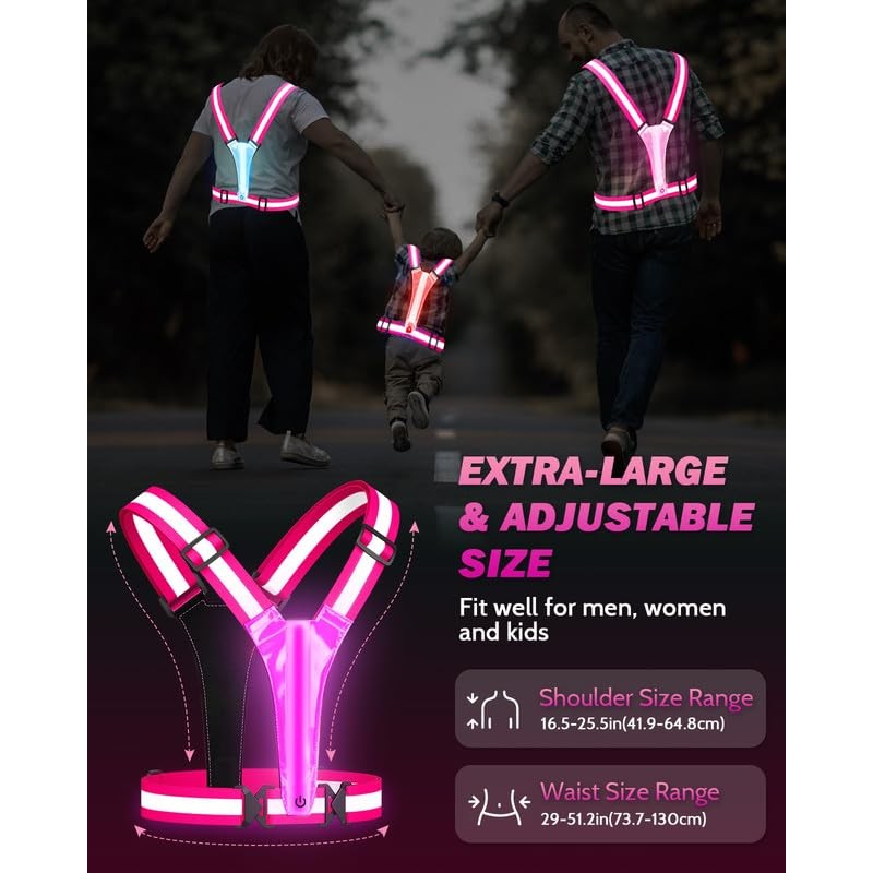 - 5 Light Colors & 3 Light Modes: Our LED running light vest for runners features 5 light colors, including White, Green, Blue, Pink and Red. Additionally, you can choose between 3 dynamic light modes - Steady On, Flash and RGB Cycle Mode, meeting your personalized needs for safety and style