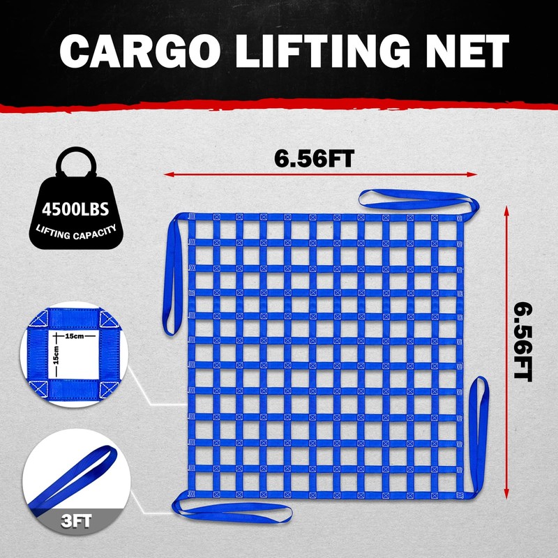 Cargo Lifting Net 4400LBS, 6.56'x6.56' Safety Lifting Net Straps for Hoist 15cm Square Mesh, Sling Hoisting Net, Heavy Duty Cargo Net for Construction Moving Hoisting Loading Unloading (Blue)