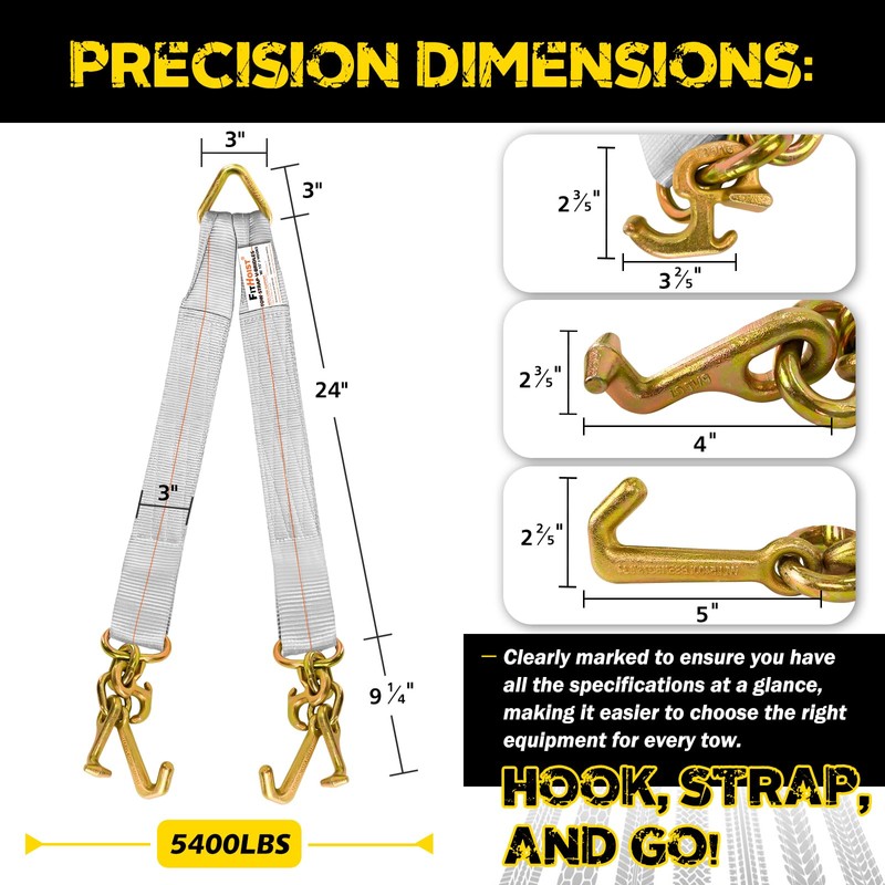 - 【Easy on the Load】Our V-Bridle Tow Strap stretches a full 24'' in length and 3 inches in width. With a working load limit of 5400 lbs and a break strength of 16,200 lbs, this strap not only covers the distance but also maintains robust performance under pressure. It's long enough to keep you safely distant during recoveries, handling the heaviest loads without breaking a sweat—or making you sweat!