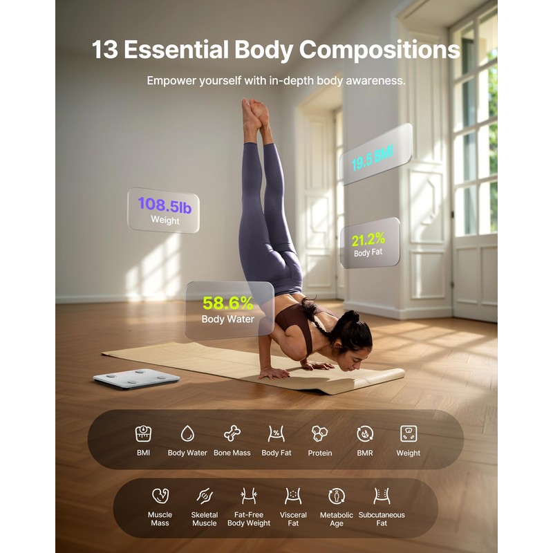 - 13 BODY COMPOSITION MEASURING FUNCTIONS - Use Bio-electrical Impedance Analysis (BIA) technology, Wireless digital scale not only shows body weight, but also syncs data to your APP including Body Fat, Water, Muscle Mass, BMI, BMR, Bone Mass, Protein, Skeletal Muscle and other data. It makes you know more data clearly about your body in time and track progress easily on your phone
