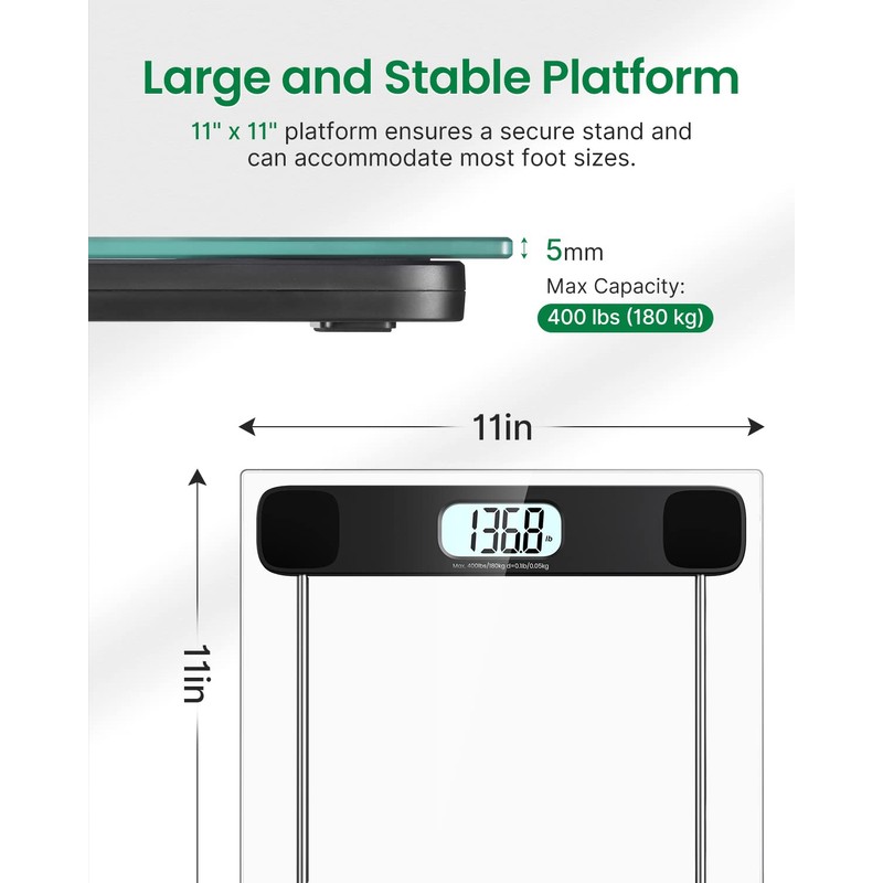- [Large Weighing Platform] With its 11 11-inch platform, this scale offers a comfortable and secure stance, ideal for whole family use. (Includes 2 AAA batteries).