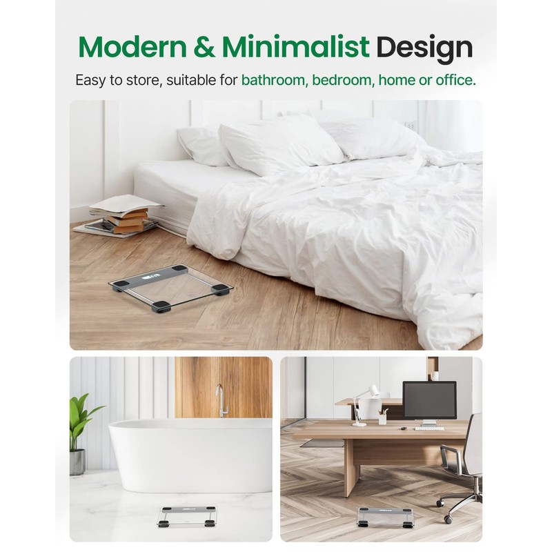 - [Modern & Sleek Design] Crafted from 5 mm tempered glass with rounded edges and anti-skid pads, the scale enhances stability and safety while ensuring easy cleaning. Its minimalist design blends seamlessly with any home decor.
