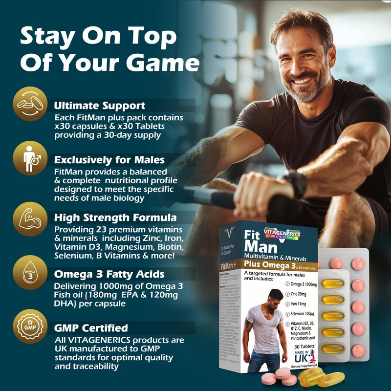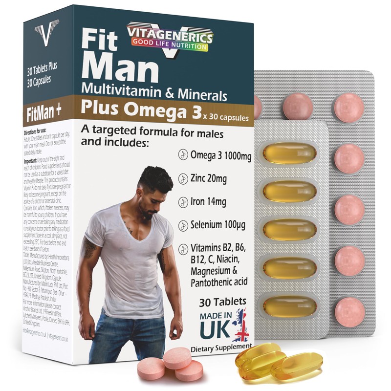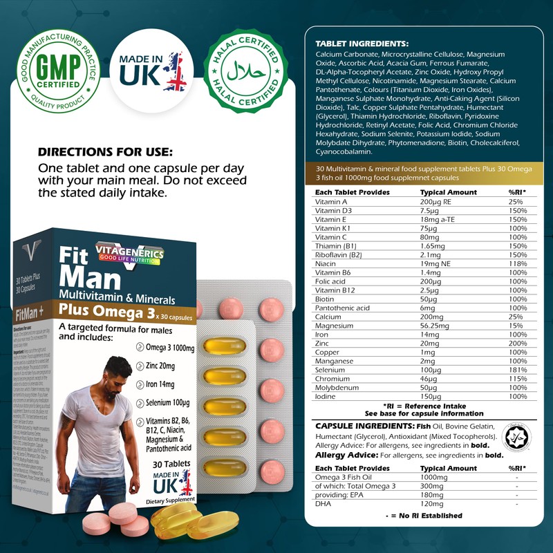Product descriptionVITAGENERICS FitMan Multivitamin & Minerals Plus Omega 3, 30 Tablets Plus 30 Capsules, with Zinc, Iron & B Vitamins, Made in UKIngredientsTablet Ingredients: Calcium Carbonate, Microcrystalline Cellulose, Magnesium Oxide, Ascorbic Acid, Acacia Gum, Ferrous Fumarate, DL-Alpha-Tocopheryl Acetate, Zinc Oxide, Hydroxy Propyl Methyl Cellulose, Nicotinamide, Magnesium Stearate, Calcium Pantothenate, Colours (Titanium Dioxide, Iron Oxides), Manganese Sulphate Monohydrate, Anti-Caking Agent (Silicon Dioxide), Talc, Copper Sulphate Pentahydrate, Humectant (Glycerol), Thiamin Hydrochlo-ride, Riboflavin, Pyridoxine, Hydrochloride, Retinyl Acetate, Folic Acid, Chromium Chloride Hexahydrate, Sodium Selenite, Potassium Iodide, Sodium Molybdate Dihydrate, Biotin, Cholecalciferol, Cyanocobalamin. Capsule Ingredients: Fish Oil, Bovine Gelatin, Humectant (Glycerol), Antioxidant (Mixes Tocopherols).