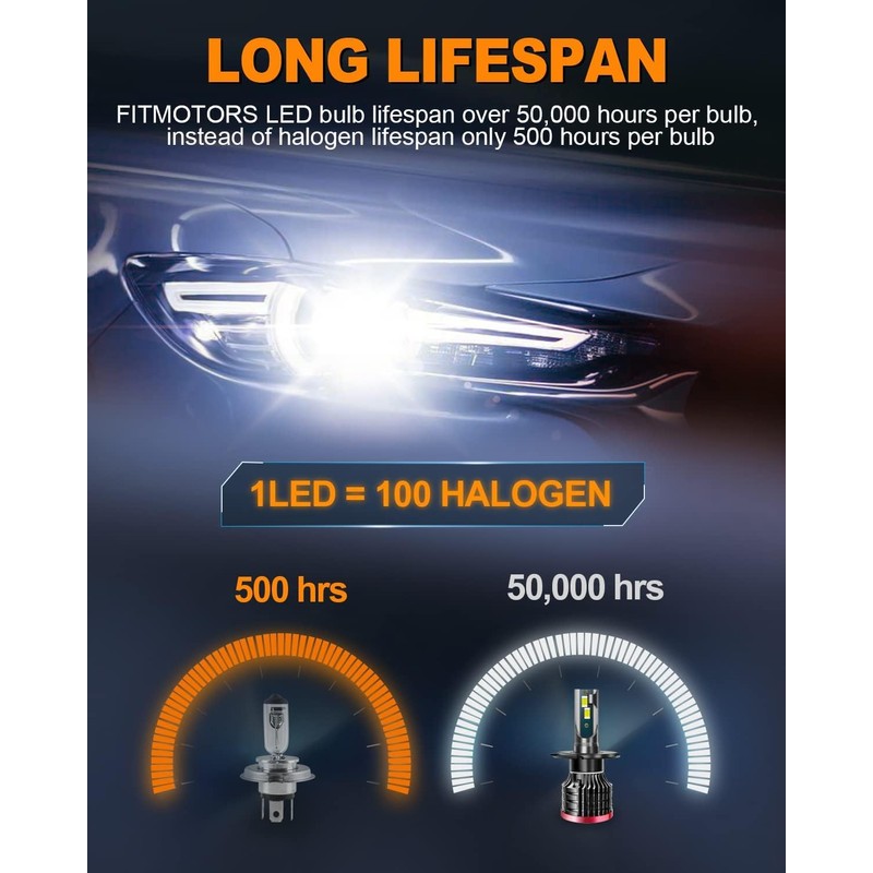 - 【Super Bright and High Performance】- The FITMOTORS H4 LED Bulbs are equipped with top automotive-grade LED chips that provide an impressive output of 80W and 16,000 lumens in total. With a cool white color temperature of 6500K, these bulbs deliver a super bright beam pattern that is 300% brighter than your original halogen bulbs. Experience enhanced visibility and safety on the road.