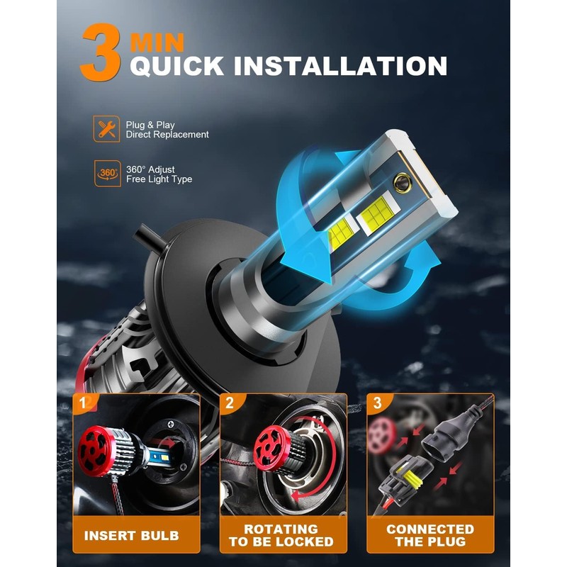 - 【Easy Installation in Just 3 Minutes】- Say goodbye to complicated installations. The H4 LED Bulbs are designed for a hassle-free plug and play installation. No tools are needed, and it only takes 3 minutes to replace your lower profile LED bulbs. Even if your factory housing has a dust cover or limited space on the passenger side, these bulbs can be easily installed.