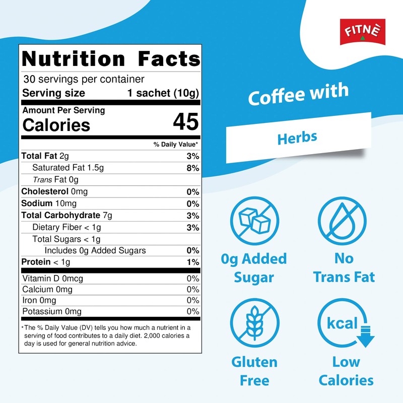 FITNE coffee save Herbs is the perfect combination of coffee and herbal extract. Our spice blend consists of Garcinia, Cinnamon and Safflower extract which creates a unique flavor and aroma. Herbal extracts also offer various natural health benefits, the balance of good taste and benefits in one cup to start your day! FITNE coffee save series are full of functional ingredients with an affordable price. Enjoy your wonderful morning with the amazing coffee aroma. Take in your daily dose of coffee that has various benefits yet delicious to drink!