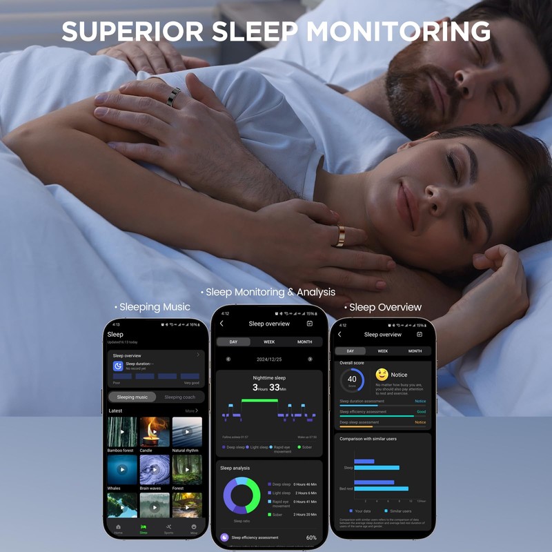 - Precision Sleep Monitoring: This ultra-thin health rings for women men can also automatically monitor your sleep. This sleep tracker ring allows you to view daily, weekly and monthly sleep data in the App. Enhance your sleep quality with detailed reports on deep sleep, light sleep, eye movement, and number of awakenings.