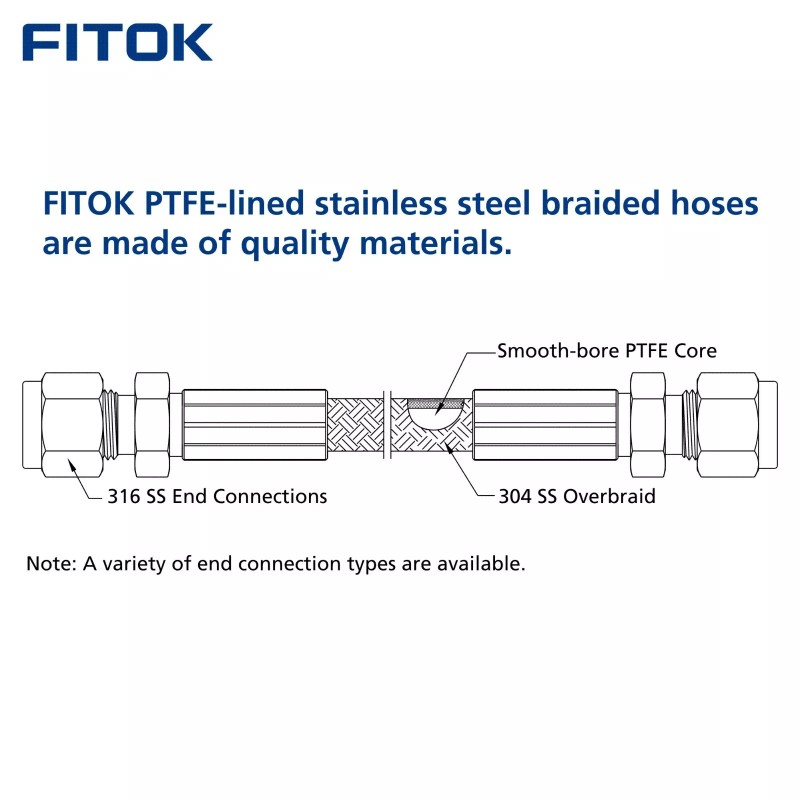 Working Pressure: Up to 3000 psi. Every FITOK PTFE-lined hose assembly is factory tested with pure water at 1.5 times the maximum working pressure.