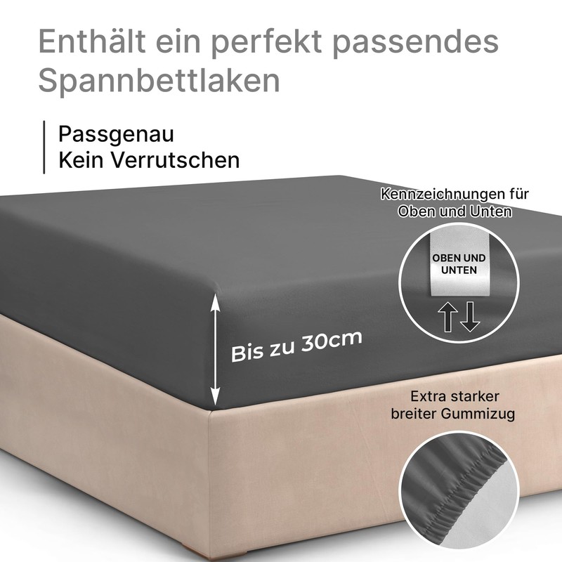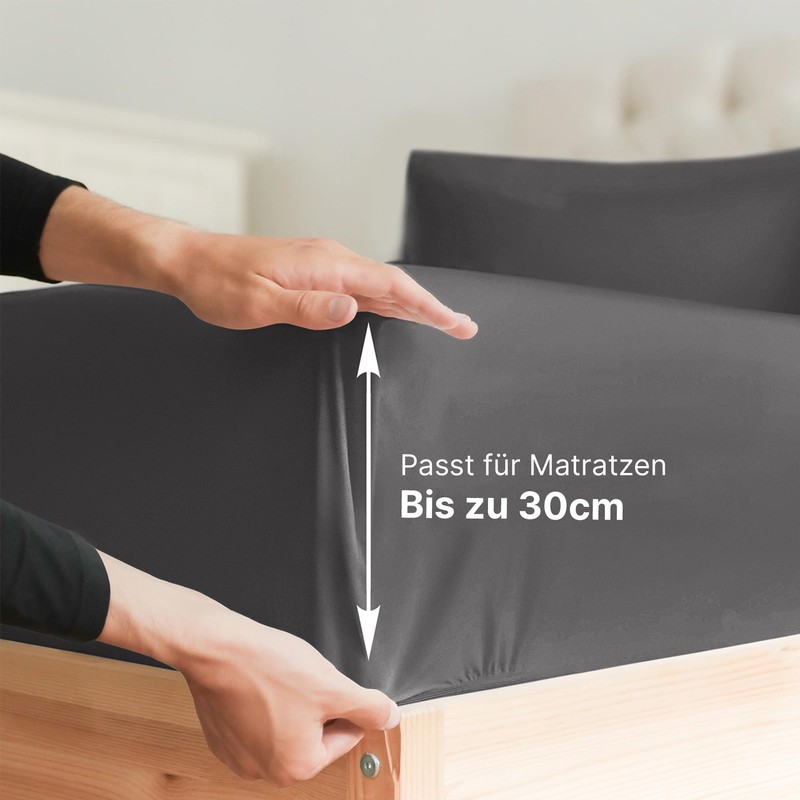 - Fitted sheet for mattresses up to 30 cm: suitable for mattresses up to 30 cm base height, our bed sheets offer the perfect fit. Thanks to the fitted sheet with elastic band, you will receive a sheet that does not slip and adapts perfectly to the mattress.