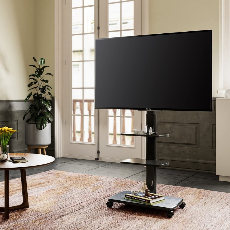 FITUEYES Rolling TV Stand, Mobile TV Cart on Wheels for 32-65 70 Inch Flat Screen TVs, Tall TV Floor Stand with Swivel Mount, Corner TV Stands for Bedroom, Outdoor, Home Office, Small Dorm, Black