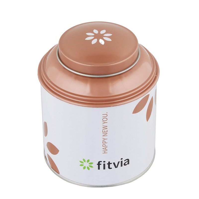 Preserve the fresh, aromatic taste of your Fitvia tea with the high-quality fitvia storage tin. This stylish tin can hold up to 100 grams of tea, depending on the variety, and optimally protects your tea from moisture, light and other harmful influences thanks to its airtight seal. This preserves the full aroma of your tea and it stays fresh for a long time.