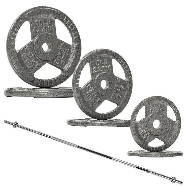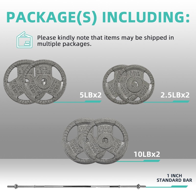 - 45 pounds set: 1x 5 feet Standard Barbell Bar (10 lbs) & Star Locks, 2x 2.5lbs, 2x 5lbs, 2x 10lbs Cast Iron Plates.
