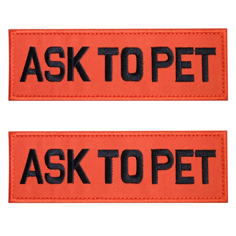 FITZNORA Embroidered Ask to Pet Patches, 2 Pack Clear Sign with Hook and Loop Pieces, Easy to Read Tabs for Dog Vest Harness Collar, 4.7 x 1.5 inches