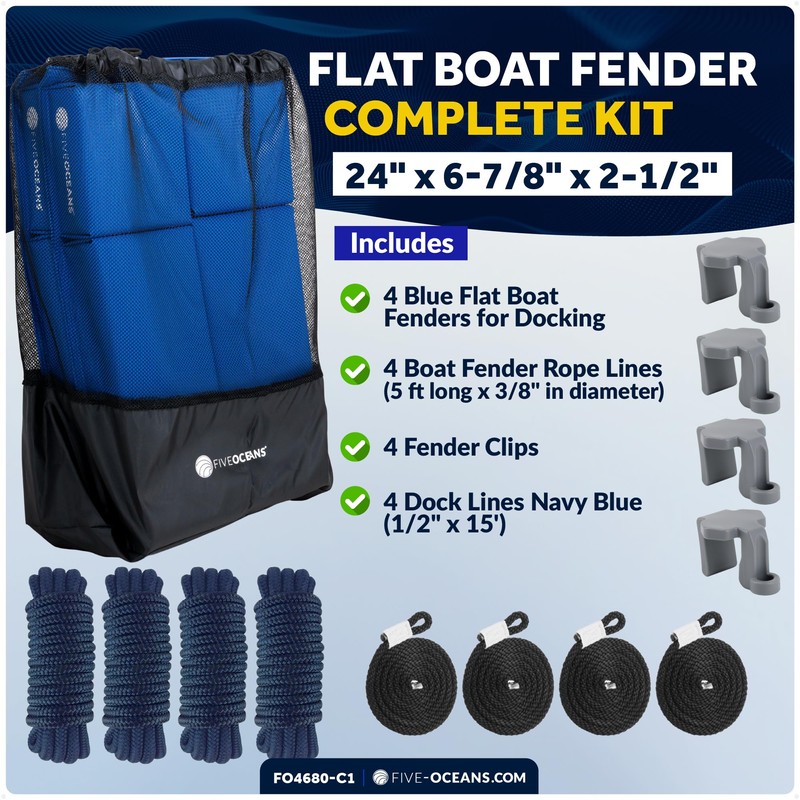 - ULTIMATE BOAT PROTECTION PACKAGE: Comprehensive docking solution with 4 blue flat boat fenders (24" x 6-7/8" x 1-1/2"), 4 navy blue 1/2" x 15' dock lines, 4 fender clips, and 4 fender ropes to shield your boat from bumps and scratches during docking