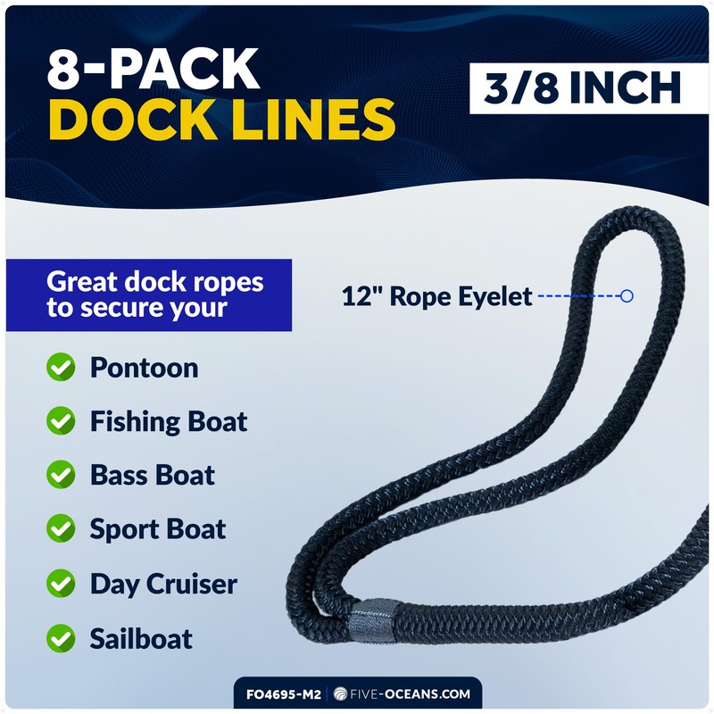 Five Oceans 8-Pack 3/8" x 15' Boat Dock Lines, Navy Blue Double Braided Nylon, Marine-Grade, 12" Eyelet, 1-Year Warranty - FO4695-M2